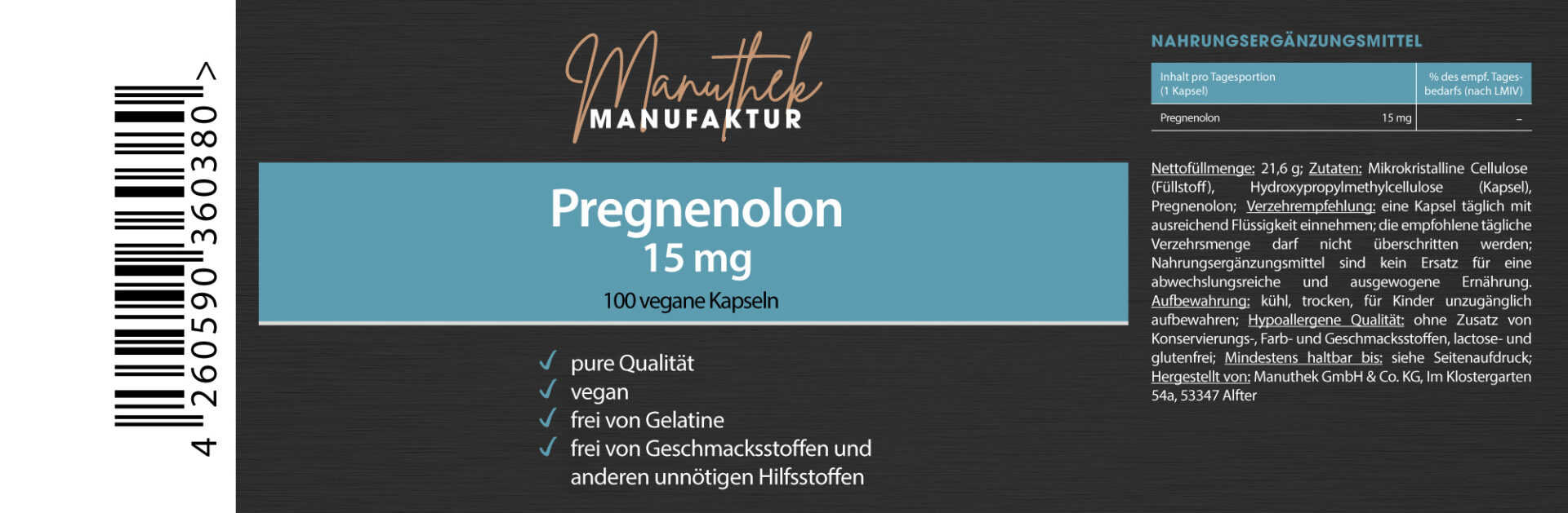 Manuthek Pregnenolon enthält 15 mg Pregnenolon pro Kapsel und wird in Dosen mit 50 oder 100 Kapseln angeboten. In der Fachliteratur und in praxisorientierten Empfehlungen werden häufig Tagesdosierungen im Bereich von 50–100 mg, teils auch geringere Mengen, beschrieben; die geeignete Dosis sollte jedoch immer individuell und vorzugsweise ärztlich abgestimmt werden.